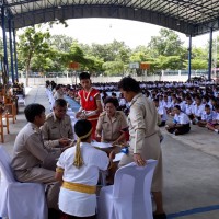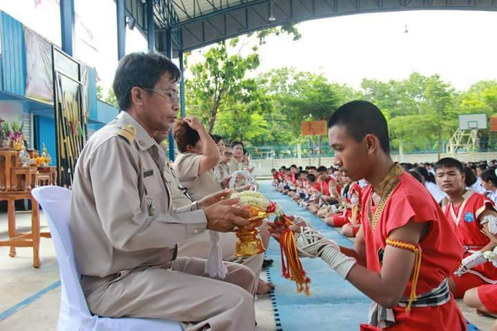 นายวิเชียร อินทมาศ ผู้อำนวยการโรงเรียนปราจีนกัลยาณี ประธานในพิธีรับพานไหว้มอบตัวเป็นศิษย์ จากนายธนฤกต ฤทธิ์ทอง ประธานชมรมมวยไทย |