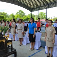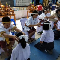 นายวิเชียร อินทมาศ ผู้อำนวยการโรงเรียนปราจีนกัลยาณี ประธานในพิธี และตัวแทนครูมวยไทย ร่วมพิธีทำน้ำมนต์ |