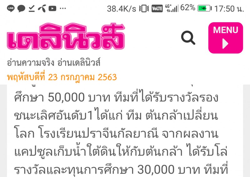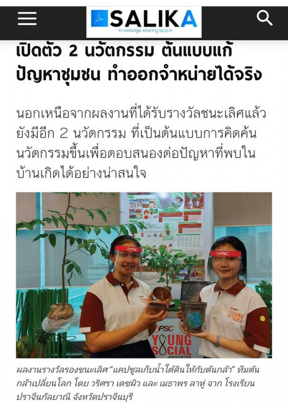 โครงงานวิทยาศาสตร์ ได้รับรางวัลรองชนะเลิศอันดับ1 พร้อมเงินรางวัลจำนวน 30,000 บาทเป็นตัวแทนประเทศไปแข่งต่อในระดับนานาชาติ ได้รับการจดสิทธิบัตร โครงงานวิทย์เรื่อง อุปกรณ์เก็บน้ำใต้ดินให้กับต้นกล้า โดยนางสาวเมธาพร ลาหู่ และ นางสาววริศรา เดชผิว นักเรียนชั้น ม.6/1 |