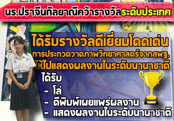 การประกวดวาดภาพวิทยาศาสตร์จินตนาการอนาคตหัวข้อเครื่องมือเครื่องใช้ในอีก 30 ปีข้างหน้า จัดการประกวดโดย สำนักงานคณะกรรมการการศึกษาขั้นพื้นฐาน (สพฐ) ผลการประกวด นางสาวแพรวพรรณ จรรัตน์ โรงเรียนปราจีนกัลยาณีได้รางวัลดีเยี่ยมโดดเด่น ได้รับโล่ ตีพิมพ์เผยแพร่ผลงาน และได้ไปแสดงผลงานในระดับนานาชาติ ครูที่ปรึกษา ครูอนุพงษ์ ศรีโสภา และคณะครูกลุ่มสาระการเรียนรู้วิทยาศาสตร์