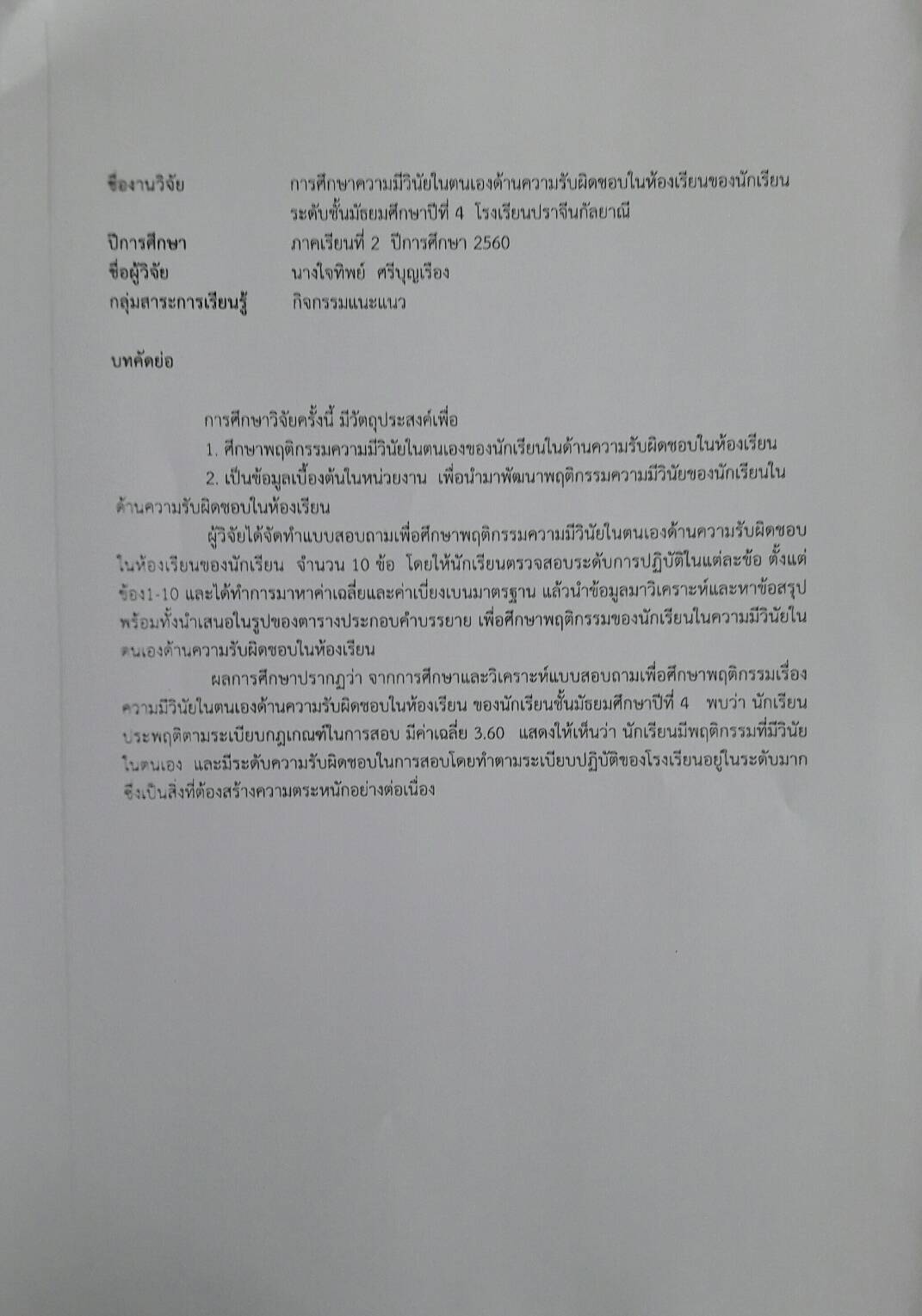 ชื่อผลงาน : ความมีวินัยในตนเองด้านความรับผิดชอบในห้องเรียนของนักเรียนชั้นมัธยมศึกษา ปีที่ 4 โรงเรียนปราจีนกัลยาณี
